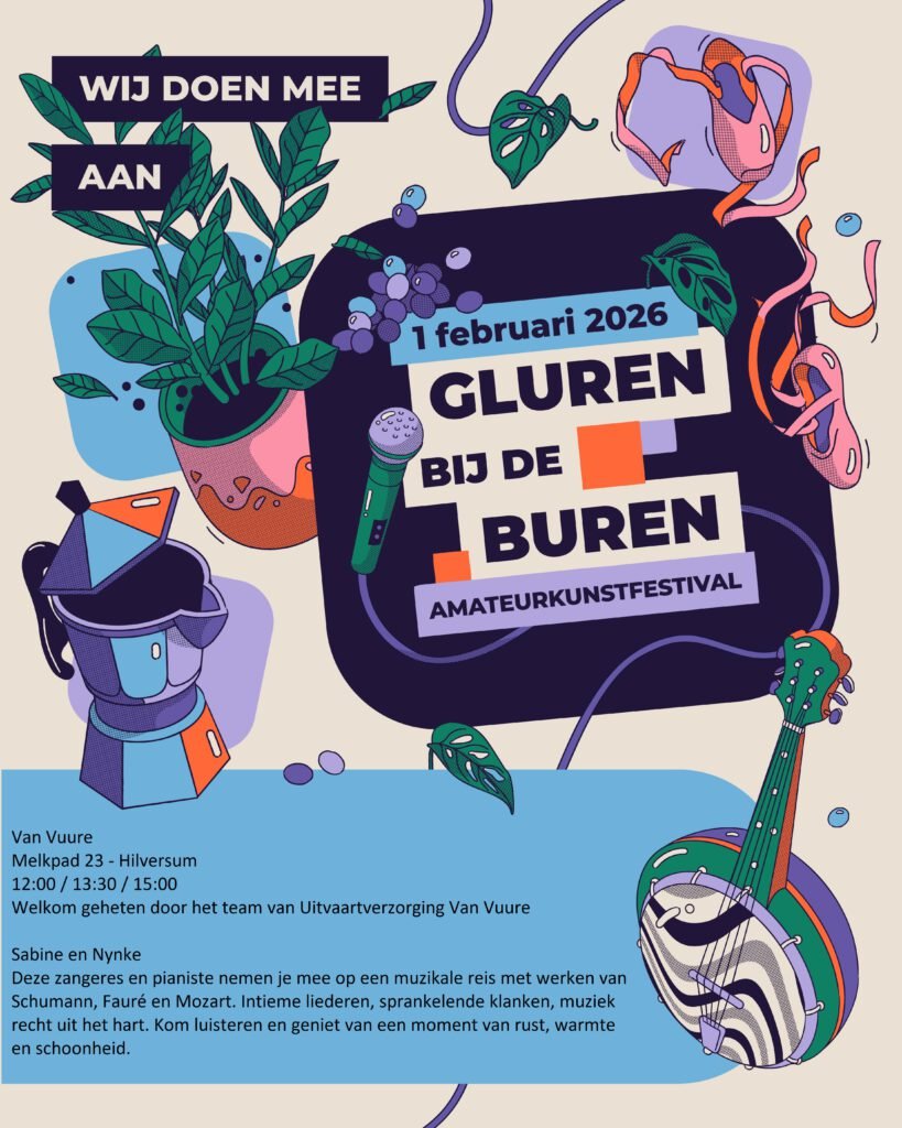 Op zondag 1 februari doet Van Vuure locatie Hilversum mee aan Gluren bij de Buren. Wij verwelkomen Sabine en Nynke, een zangeres en pianiste. Zij brengen een programma met werken van Schumann, Fauré en Mozart. Laat u meevoeren door hun intieme liederen en sprankelende klanken, muziek die recht uit het hart komt. Kom luisteren en geniet van een moment van rust en harmonie. Meer informatie over Gluren bij de Buren.